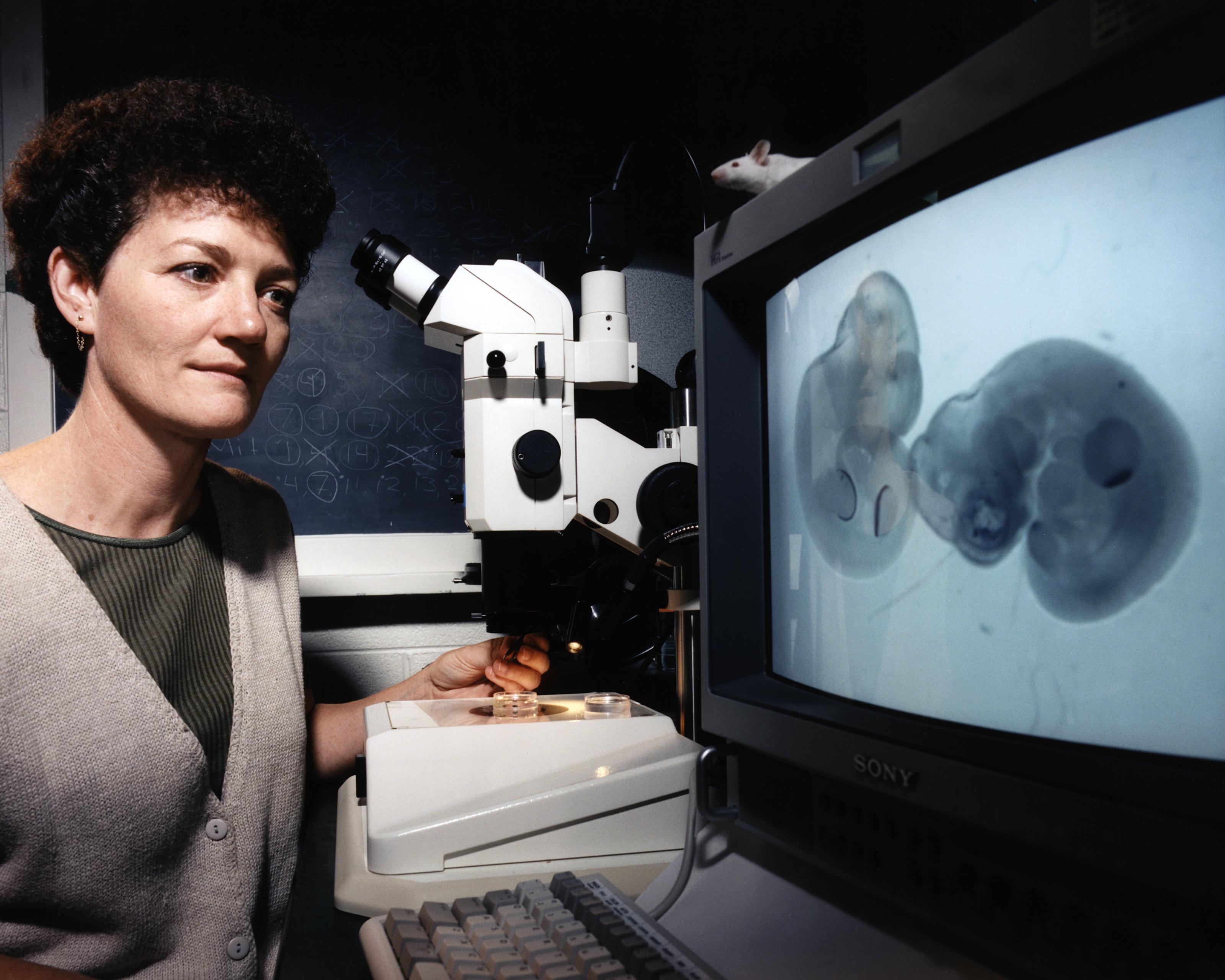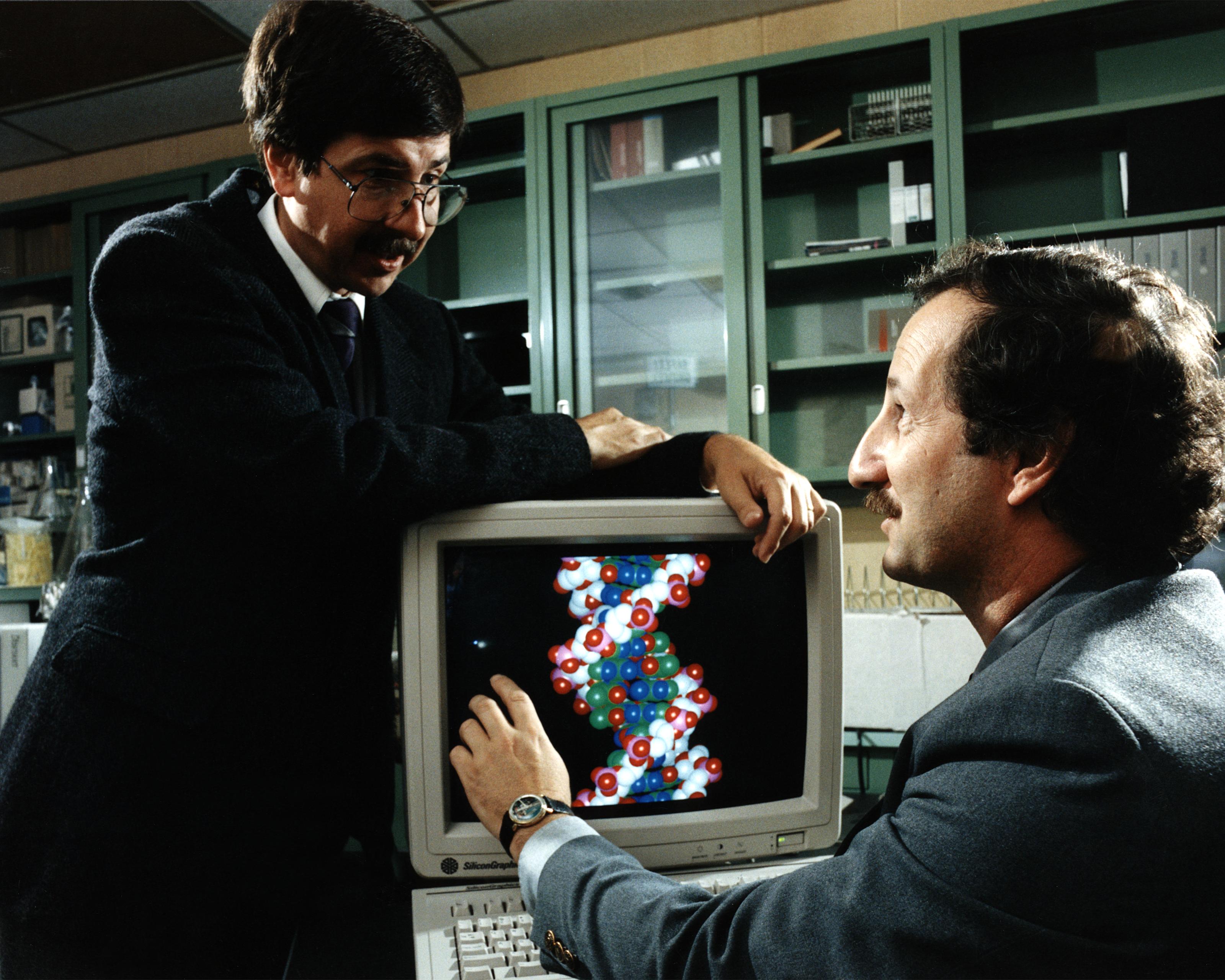 Two scientists discuss a strand of DNA shown in a computer simulation (Source: Department of Energy, Flickr).